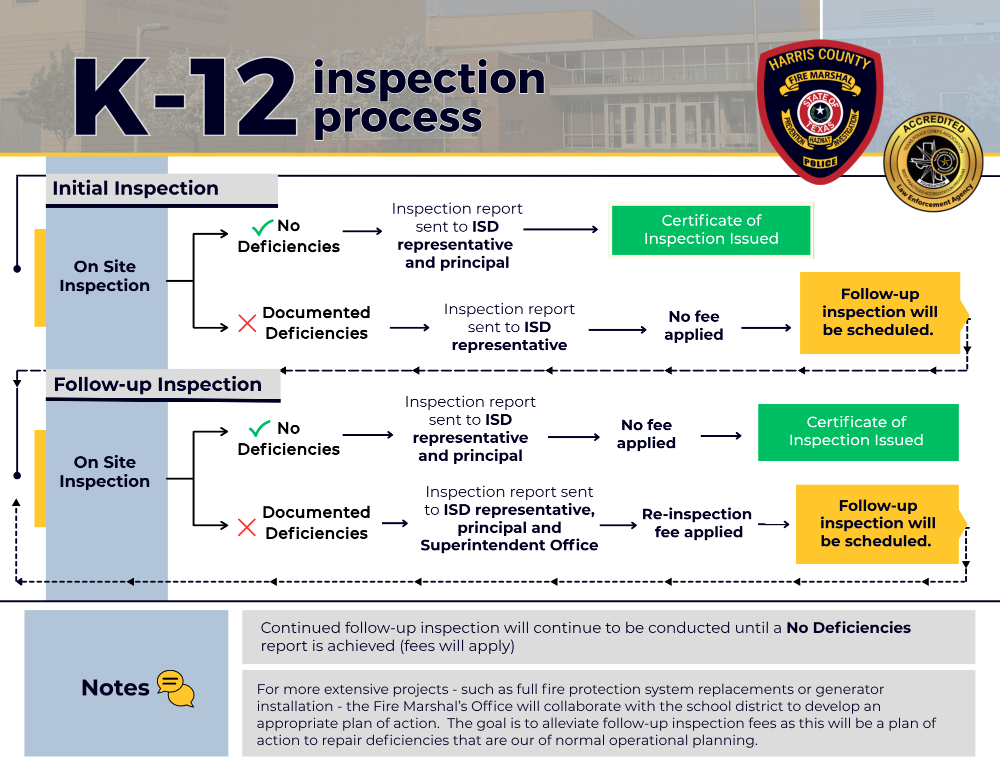 Established in 2006, the Harris County Fire Marshal’s School Inspection Team was created in response to concerns raised by residents and the Commissioners Court regarding the safety of school facilities in unincorporated Harris County, Texas.